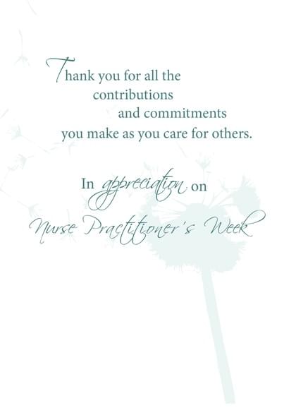Card inside says: Thank you for all the contributions and commitments you make as you care for others. In appreciation on Nurse Practitioner's Week