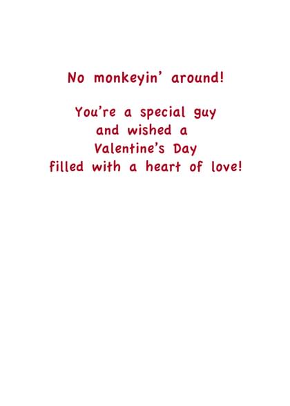 Card inside says: No monkeyin' around! You're a special guy and wished a Valentine's Day filled with a heart of love!