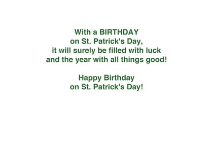 Card inside says: With a BIRTHDAY on St. Patrick's Day, it will surely be filled with luck and the year with all things good! Happy Birthday on St. Patrick's Day!