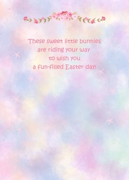 Card inside says: These sweet little bunnies are riding your way to wish you a fun-filled Easter day!
