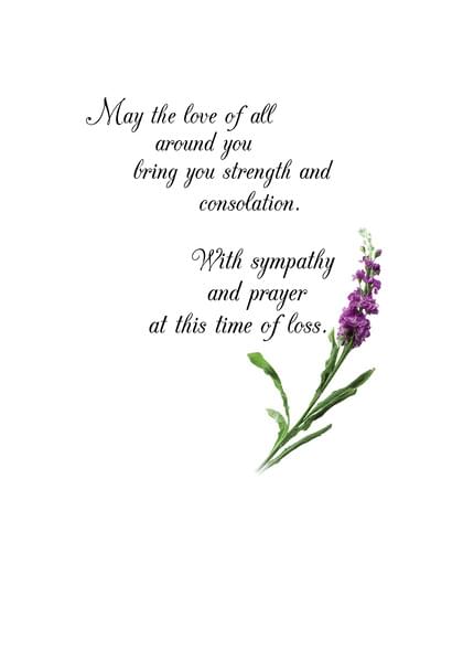 Card inside says: May the love of all around you bring you strength and consolation. With sympathy and prayer at this time of loss.