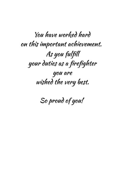 Card inside says: You have worked hard on this important achievement. As you fulfill your duties as a firefighter you are wished the very best. So proud of you!