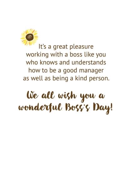 Card inside says: It's a great pleasure working with a boss like you who knows and understands how to be a good manager as well as being a kind person. We all wish you a wonderful Boss's Day!