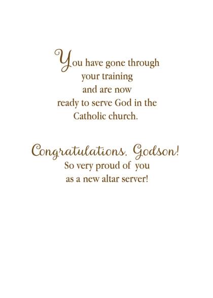 Card inside says: You have gone through your training and are now ready to serve God in the Catholic church. Congratulations. Godson! So very proud of you as a new altar server!