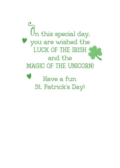 Card inside says: On this special day, you are wished the LUCK OF THE IRISH and the MAGIC OF THE UNICORN! Have a fun St. Patrick's Day!