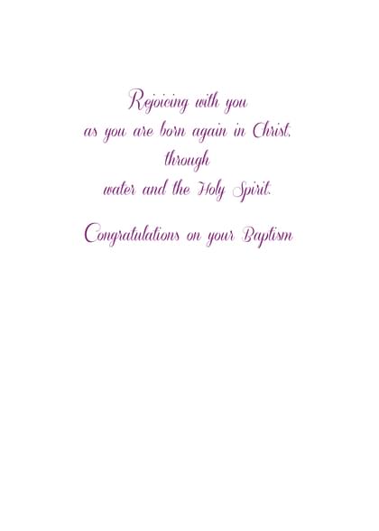 Card inside says: Rejoicing with you as you are born again in Christ. through water and the Holy Spirit. Congratulations on your Baptism