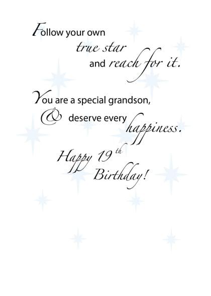 Card inside says: Follow your own true star and reach for it. You are a special grandson, & deserve every happiness. Happy 19th Birthday!