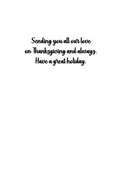 Card inside says: Sending you all our love on Thanksgiving and always Have a great holiday.