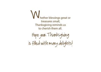 Card inside says: Whether blessings great or treasures small, Thanksgiving reminds us to cherish them all. Hope your Thanksgiving is filled with many delights!