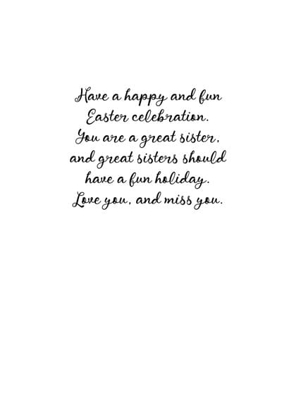 Card inside says: Have a happy and fun Easter celebration. You are a great sister. and great sisters should have a fun holiday. and miss you. Love you.