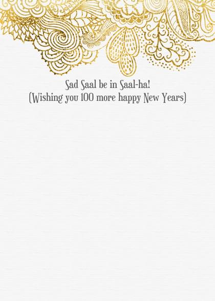 Card inside says: Sad Saal be in Saal-ha! (Wishing you 100 more happy New Years)