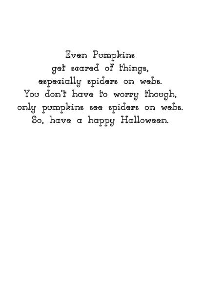 Card inside says: Even Pumpkins get seared of things, especially spiders on webs. You don't have to worry though, only pumpkins see spiders on weba. So, have a happy Halloween.
