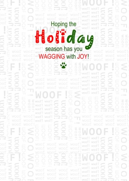Card inside says: Hoping the Holiday oo season has you WAGGING with JOY! o oot woo woof woo woo WOOFI WOOF WOOF! WoOr WOOF WOOWOOF WOOF WOUOOF WOC wool woof wool NOOF! JOOF WOOF IOOFI woof! woof! woof! uoof! woof! woof! WOOF WOOF WOOF woof! woof! wof! HOom A WOOFI WOOF! waor voOFI WOOF WOOF WOOFI woof! woof! oof! woof! woof! WOOFI KOOF! WODFI WOOF! WOOF! OOFI WODFI DOFI pof! pof! DOFI toof! oof! DOFI WOOFI OOFI WOOFI OOFI DOFI NOOF! WoT WOOFI WOOF! WOOF WOOF WOOF WOOFI woof! woof! OOMOOM WOOF WOWOOF WOC wool wool! JOOF WOOF WOOFI woof! woof! 88 pof! woof! woof! woof! woof! oof!