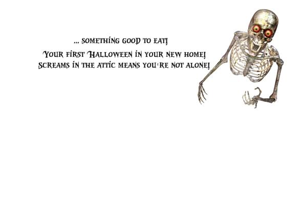 Card inside says: ... SOMETHING GO0D TO EAT! YOUR FIRST HALLOWEEN IN YOUR NEW HOME? SCREAMS IN THE ATTIC MEANS YOU RE NOT ALONE!